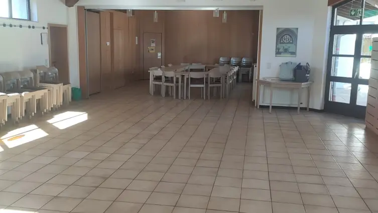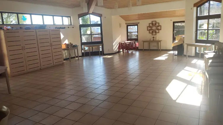 Es ist barrierefrei und verfügt über einen großen Saal für ca. 80 - 100 Personen, der wahlweise durch eine mobile Trennwand aufgeteilt werden kann.