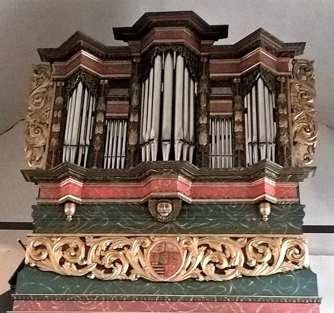 Von der ersten Orgel der Kirche, die von dem zu seiner Zeit bedeutenden Orgelbauers Johann Georg Dreuth aus Griedel erbaut wurde, ist heute noch der Prospekt (= die Schauseite) der Orgel erhalten.