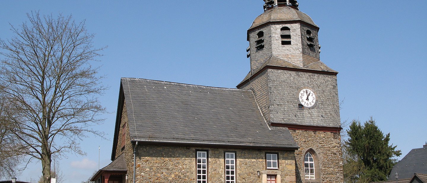 Die evangelische Kirche Krumbach befindet sich erhöht an der Marburger Straße und liegt direkt am Friedhof.